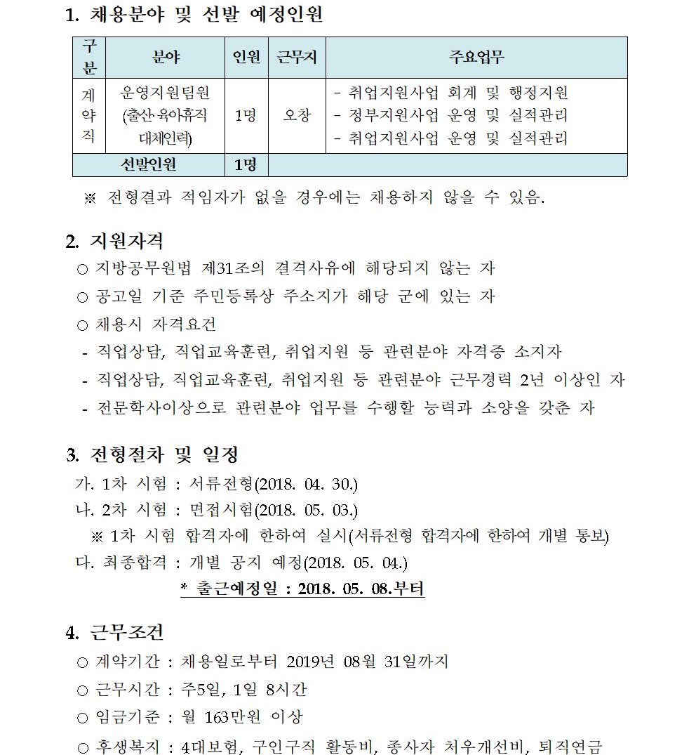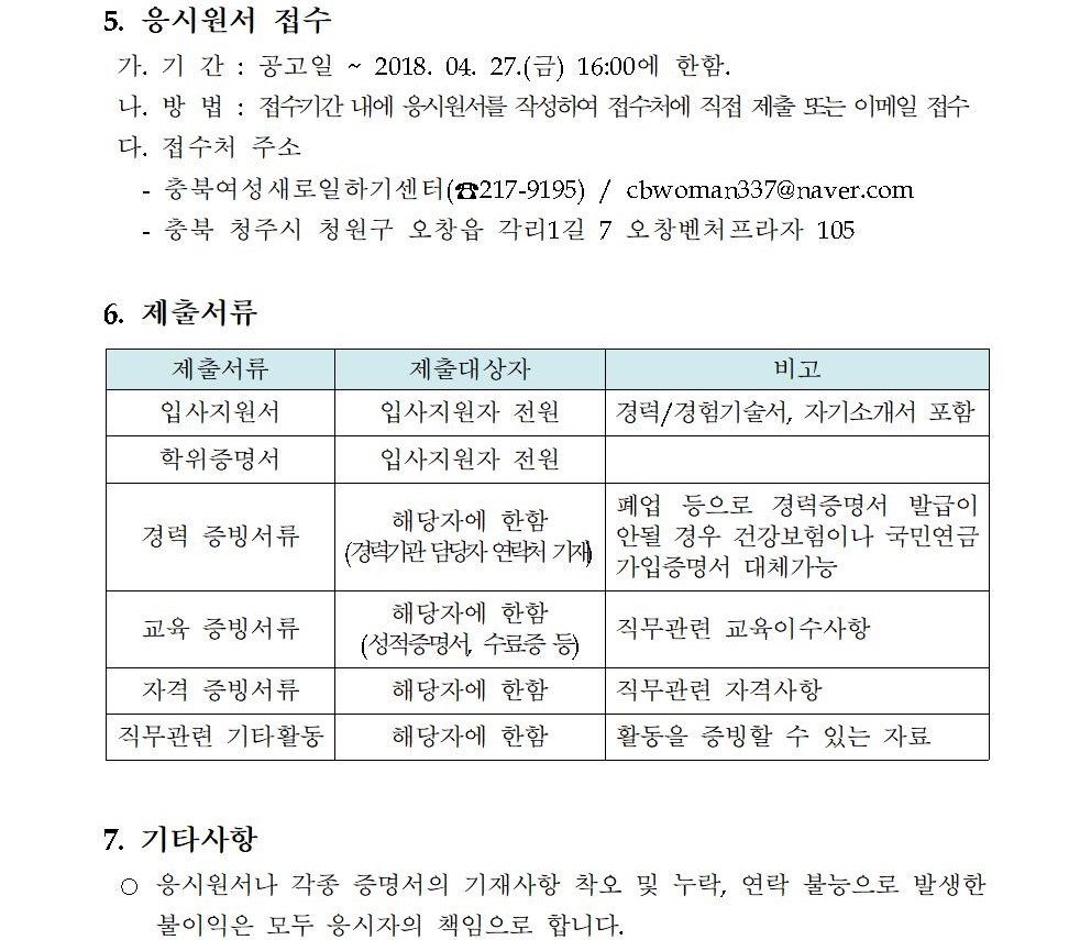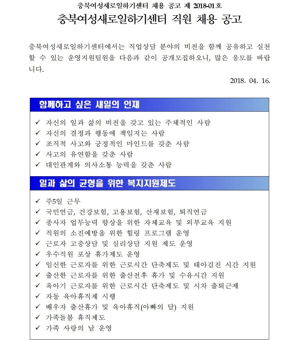 (운영지원팀원) 충북여성새일센터 채용 공고 제 2018-01호